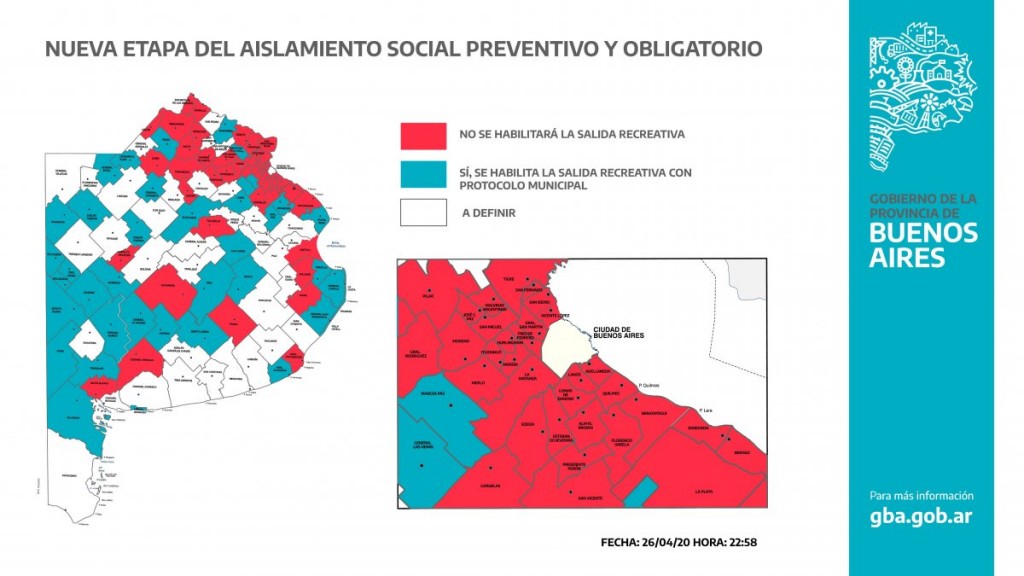 El gobernador de la provincia de Buenos Aires, Axel Kicillof, publicó el mapa de los distritos en los que se podrá salir una hora todos los días "para evitar la proliferación de versiones" sobre este tema.