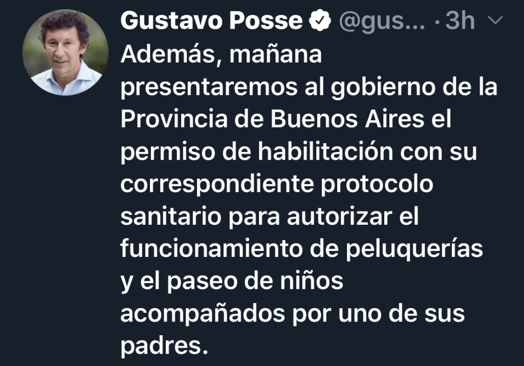 GUSTAVO POSSE: "PRESENTAREMOS A LA PROVINCIA DE BUENOS AIRES LA HABILITACIÓN DE PELUQUERÍAS Y EL PASEO DE NIÑOS ACOMPAÑADOS POR UNO DE SUS PADRES"