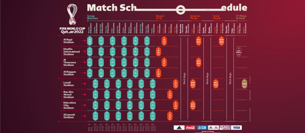Con el fin de que todas las selecciones dispongan del tiempo suficiente para recuperarse, la fase de grupos tendrá una duración de doce días; se jugarán cuatro partidos al día, por lo que el calendario promete ser de lo más emocionante. La naturaleza compacta del torneo catarí —en el que no serán necesarios los desplazamientos aéreos— permitirá por primera vez a los organizadores optimizar los partidos en beneficio de la afición, las selecciones y los medios de comunicación.