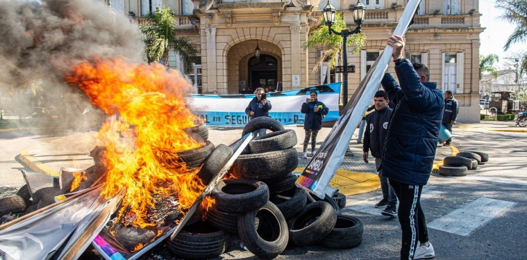 Dirigentes e integrantes del sindicato del Personal de Seguridad de la República Argentina armaron una hoguera con decenas de carteles de la campaña y los neumáticos que trajeron a las puertas del Palacio Municipal.