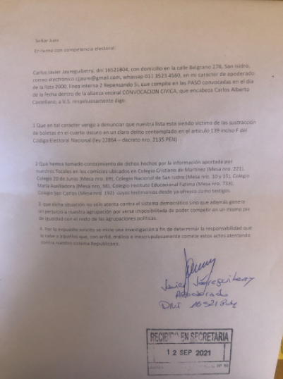 La agrupación denuncio ante la justicia electoral el robo de boletas