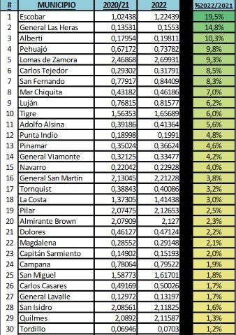 Junto a La Matanza hay otros cinco distritos que se encuentran prácticamente empatados entre los periodos 2020/2021 y 2022. Entre ellos se destaca Carmen de Areco, casi sin variación. Pasó de 0,10087% a 0,1009%.