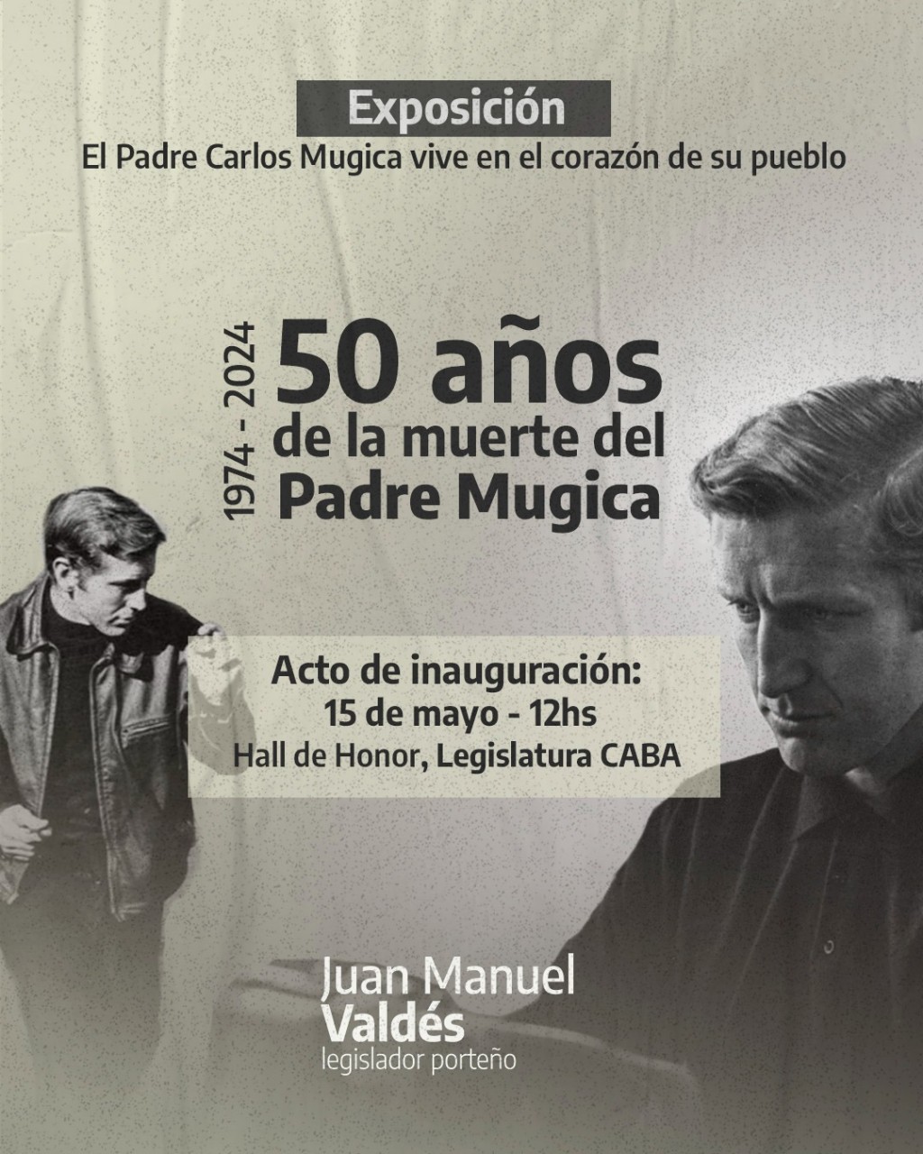 . El miércoles 15 de mayo a las 12 hs se inaugura por iniciativa del legislador Juan Manuel Valdés la exposición “El Padre Carlos Mugica Vive en el Corazón del Pueblo”, organizada por la Parroquia Cristo Obrero y el Centro “Nueva Tierra”, a medio siglo de la muerte del sacerdote y referente de los barrios populares. Esta muestra itinerante recorrió gran parte de las villas de la Ciudad y el Gran Buenos Aires, y llega este mes a la Legislatura porteña, donde además será declarada de interés cultural por Valdés. Las exposición podrá visitarse hasta el 17 de mayo, entre las 9 y las 19 hs, en el Hall de Honor de la Legislatura (Perú 160).