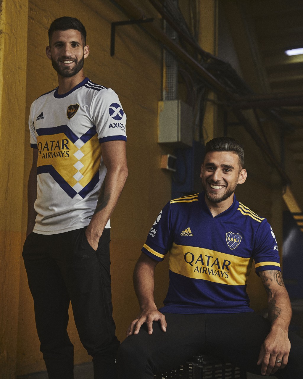 Lisandro Lopez y Eduardo Salvio muestran las nuevas camisetas de Boca Juniors tituilar y  por la marca Adidas