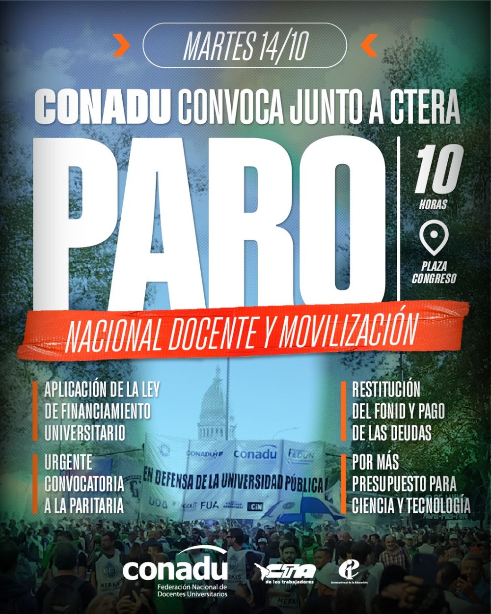 El Plenario de Secretarias y Secretarios Generales del Frente Gremial Universitario (Conadu) anunció este lunes que se suma al paro nacional con movilización convocado por Ctera para este martes 14 de octubre.