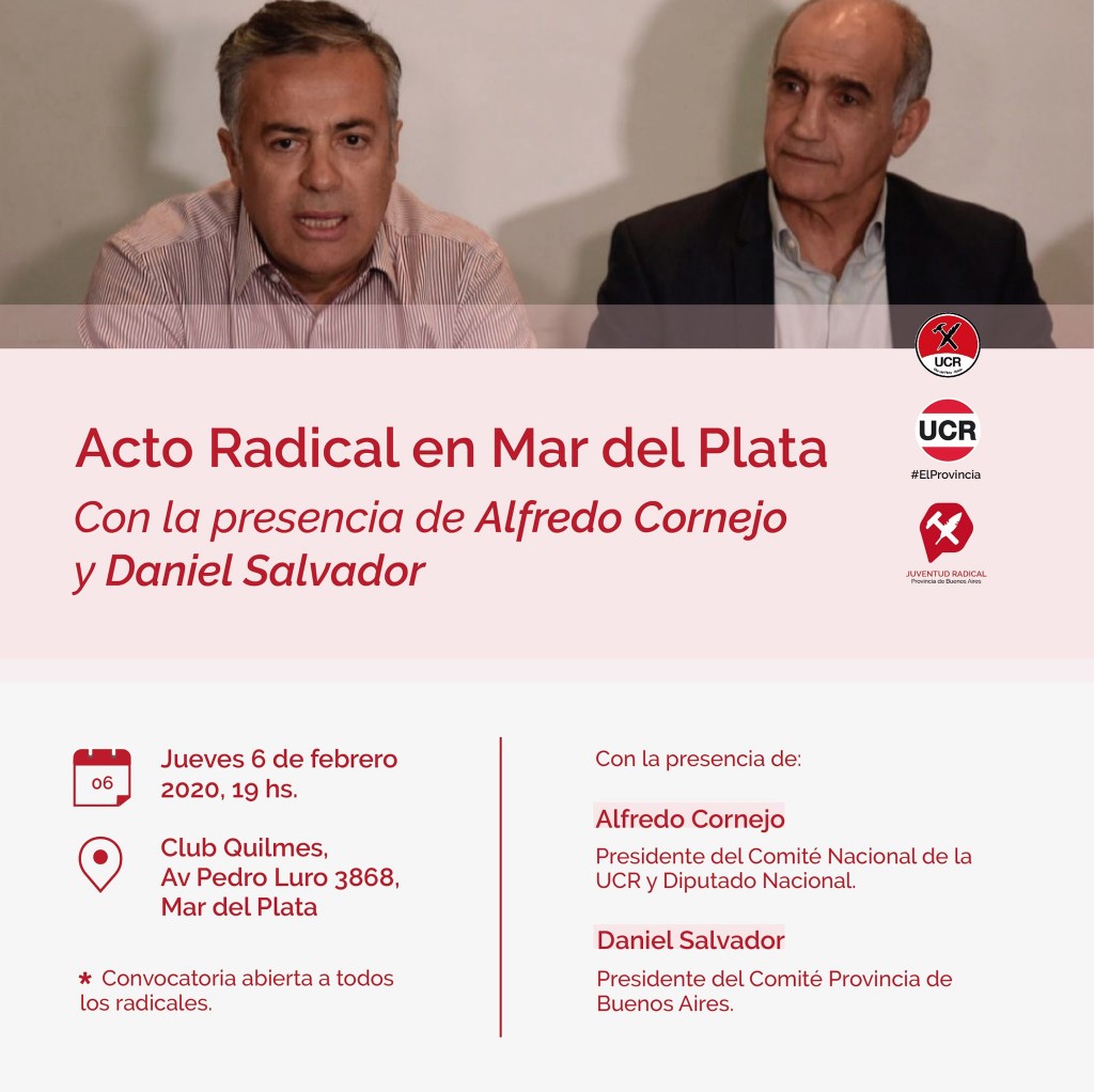 El jueves 06 de febrero loas radicales bonaerenses se reunen ennMar del Plata. El acto será encabezado por los titulares nacional y provincial de nuestro centenario partido. El Diputado Nacional Alfredo Cornejo, Presidente del Comité Nacional, y el ex Vicegobernador de , Daniel Salvador, Presidente del Comité Provincia de la UCR Buenos Aires. Tambien estará el Presidente del Bloque de Juntos Por el Cambio en Diputados BA, el Diputado Provincial y marplatense Maximiliano Abad.