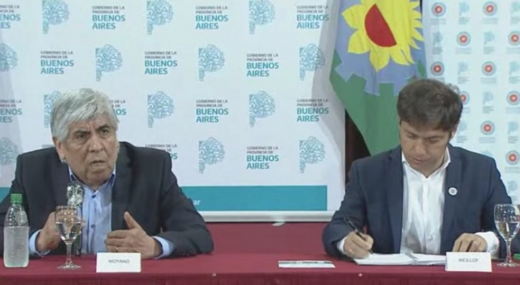 El gobernador bonaerense, Axel Kicillof, se mostró hoy con el líder camionero, Hugo Moyano, quien llamó a "seguir haciendo el esfuerzo necesario" frente a la pandemia de coronavirus "primero en salud y después en lo económico".
