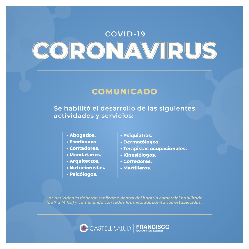 La Municipalidad de Castelli informa que luego de varias gestiones ante el Gobierno de la Provincia y gracias a un trabajo coordinado con los Ministerios de Salud y de Producción, y la Jefatura de Gabinete, se autorizó en nuestra ciudad la reanudación de la atención al público para actividades que dependen de colegios profesionales públicos.