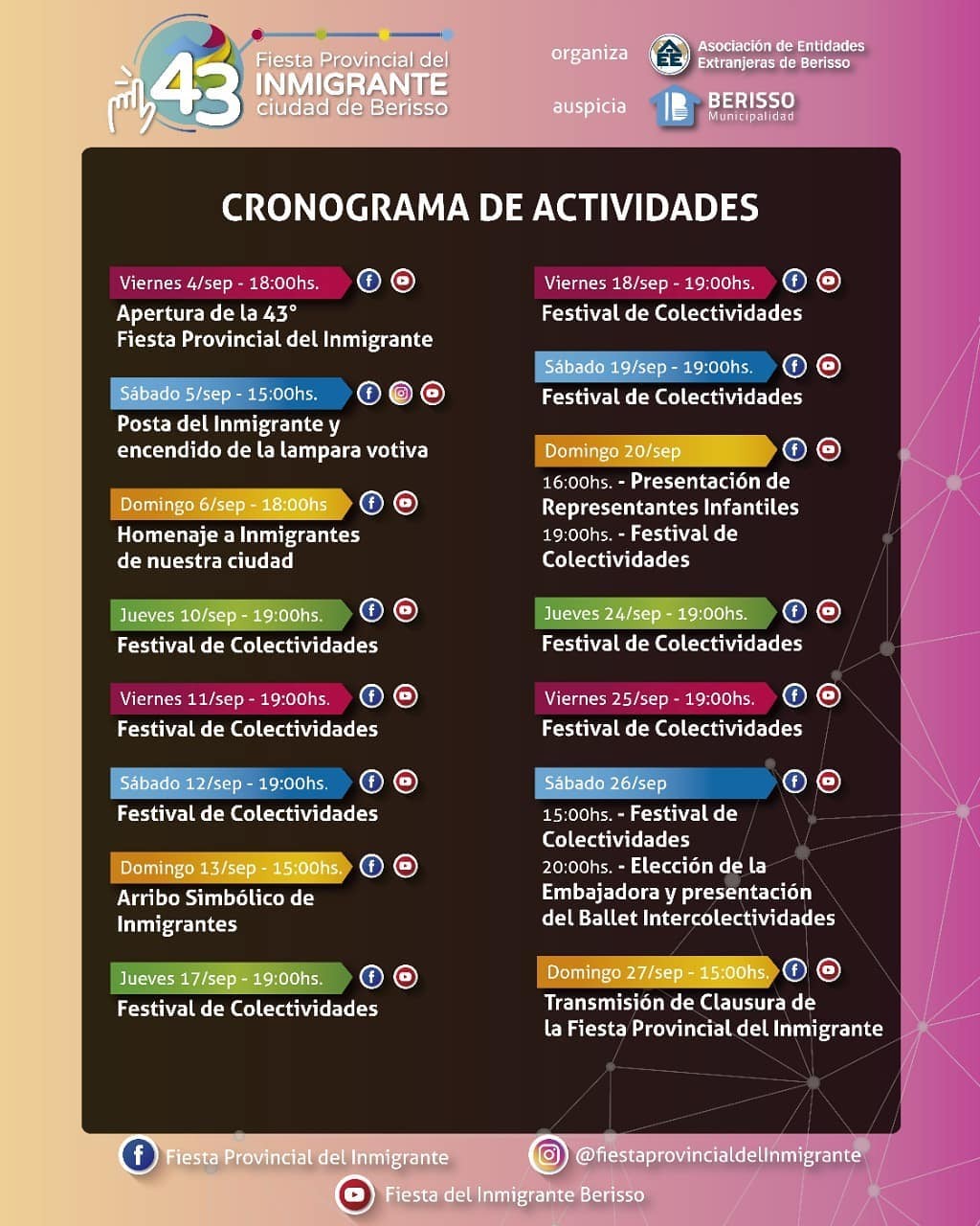 Las redes donde podrá disfrutarse de esta nueva modalidad de celebración de la tradicional Fiesta berissense que da cuenta de la historia y conformación multicultural de la ciudad, podrá seguirse en Facebook como Fiesta Provincial del Inmigrante; en twitter @FPInmigrante; en Instagram @fiestaprovincialdelinmigrante y el canal de youtube Fiesta Provincial del Inmigrante Berisso.
