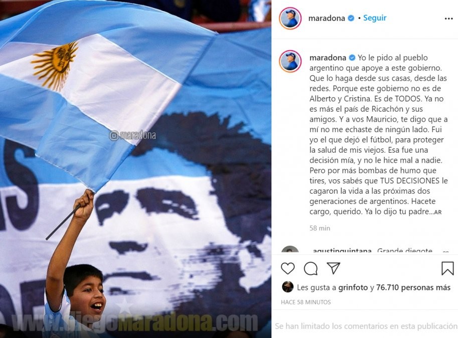 "Yo le pido al pueblo argentino que apoye a este Gobierno. Que lo haga desde sus casas, desde las redes. Porque este gobierno no es de Alberto y Cristina. Es de TODOS. Ya no es más el país de Ricachón y sus amigos", escribió Maradona en Instagram.