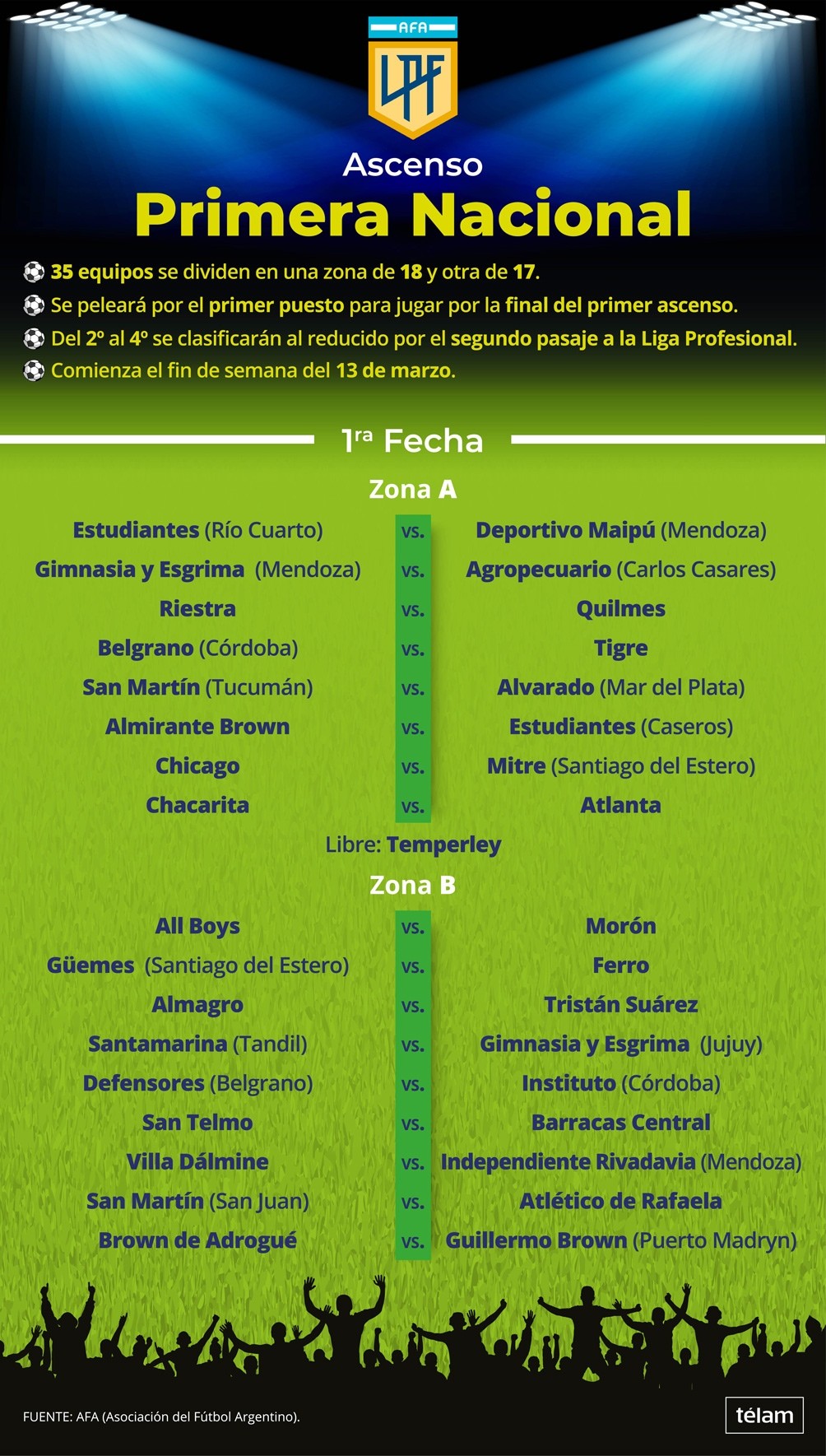 Por su parte, Estudiantes de Río Cuarto, que perdió las dos finales por el ascenso en la 2019-2020, debutará de local ante el reciente ascendido Deportivo Maipú de Mendoza.