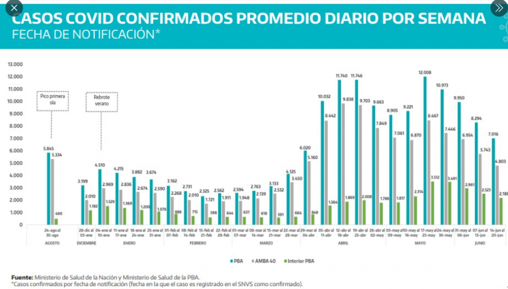 De acuerdo a los datos oficiales, el promedio semanal diario de casos en todo el territorio bonaerense fue de 7.016 (la semana pasada había sido de 8.294 y el pico, hace un mes de 12.008). De ese total, 4.803 se dieron en el AMBA y 2.188 en el interior.