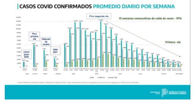 “Gracias a las medidas de cuidado sostenidas y al éxito de la estrategia y la planificación de la campaña de vacunación Buenos Aires Vacunate, la Provincia de Buenos Aires registró por decimoquinta semana consecutiva una baja en el promedio semanal de los casos por Coronavirus”, señaló la cartera sanitaria en un comunicado.