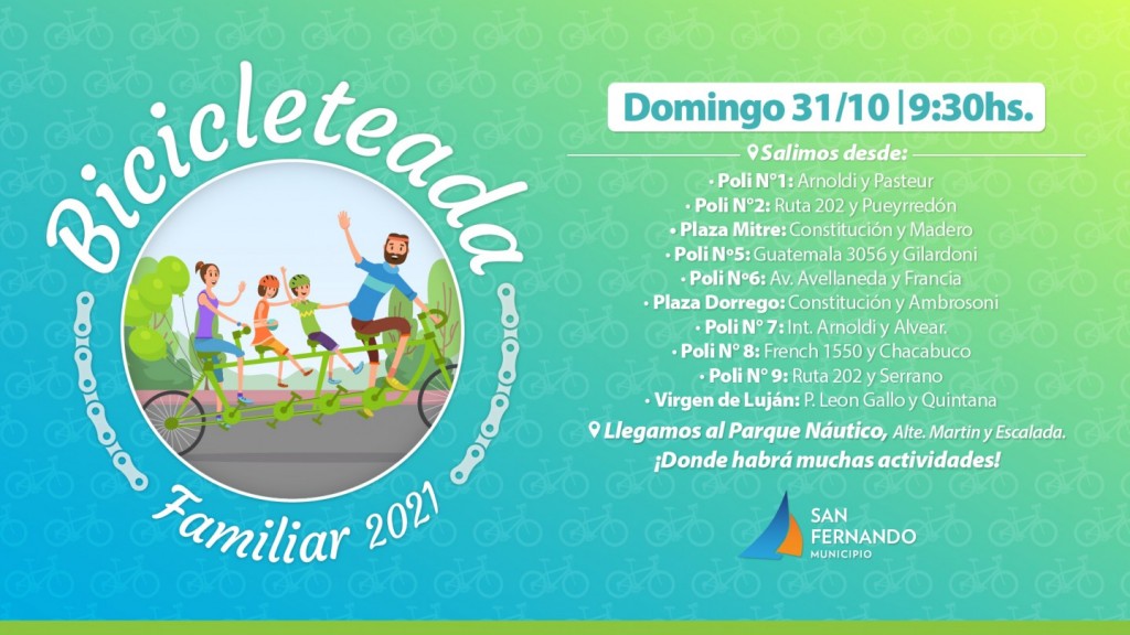 En el marco de los festejos por la primavera, invitamos a todos los vecinos a sumarse a la gran “Bicicleteada Familiar 2021” que se realizará este domingo 31 de octubre, a las 9:30hs, con partida desde diez puntos ubicados estratégicamente en el distrito. La llegada será en el Parque Náutico, en Almirante Martín y Escalada. La entrada es libre y gratuita.