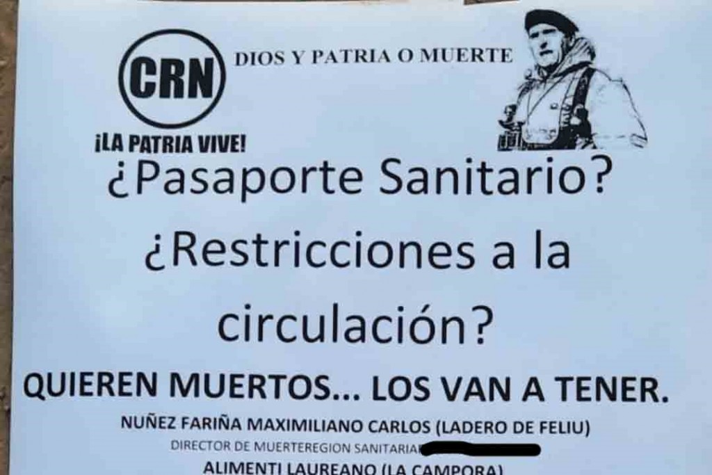 En el sitio se hallaron además panfletos con expresiones en contra del pase sanitario y la restricción de circulación, firmados por un supuesto grupo autodenominado Comando de Restauración Nacional (CRN). También se consignan los nombres de otros profesionales de la salud de la ciudad y direcciones personales, junto a la amenaza “quieren muertos, los van a tener”.