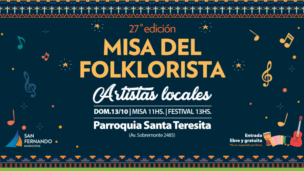 El Municipio de San Fernando invita a los vecinos a participar de la vigésimo séptima edición de la Misa del Folklorista, tradicional encuentro de la comunidad que tendrá lugar el domingo 13 de octubre desde las 11 horas en la Parroquia Santa Teresita, en Av. Sobremonte 2485.
