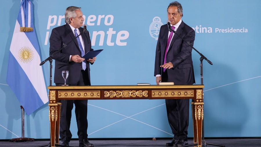 El momento de la jura de Daniel Scioli ante el presidente Alberto Fernández (Foto: Presidencia).