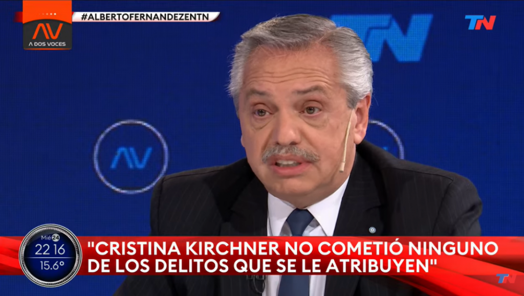 El presidente Alberto Fernández expresó esta noche en declaraciones televisivas que “Cristina (Fernández) es una mujer honesta” y no tiene nada que ver con la llamada “causa Vialidad”, por la que el fiscal Diego Luciani pidió 12 años de prisión en su alegato.