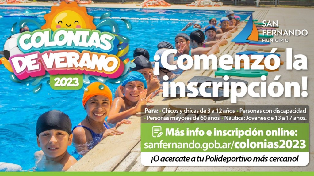 Comenzó la inscripción digital en la web www.sanfernando.gob.ar/colonias2023 o presencial en los Polideportivos municipales. Podrán anotarse chicas y chicos de 3 a 12 años, personas mayores de 60, personas con discapacidad y jóvenes de entre 13 y 17 años de la Colonia Náutica. Del 2 de enero al 17 de febrero, San Fernando tendrá la mejor temporada de piletas y actividades al aire libre.