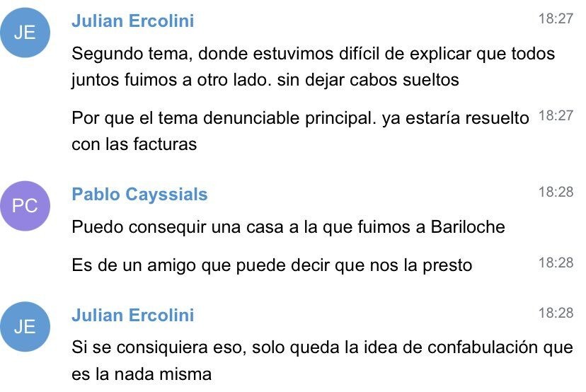 En las conversaciones, los integrantes del grupo planean como frenar notas periodísticas y debaten la manera de frenar una causa judicial que se abrió por el viaje. “Muchachos les cuento: la fiscal federal de Bariloche bien, buena predisposición, me ofreció mandar la causa a Py o en su defecto pedir o que aportemos nosotros o ella pedir a la empresa las facturas del vuelo y eventualmente del hospedaje con los denunciados digamos sin Jorge y sin Pablo y en base a eso cerrarla así que si están de acuerdo avanzo en alguna de estas opciones”, dice Mahiques.