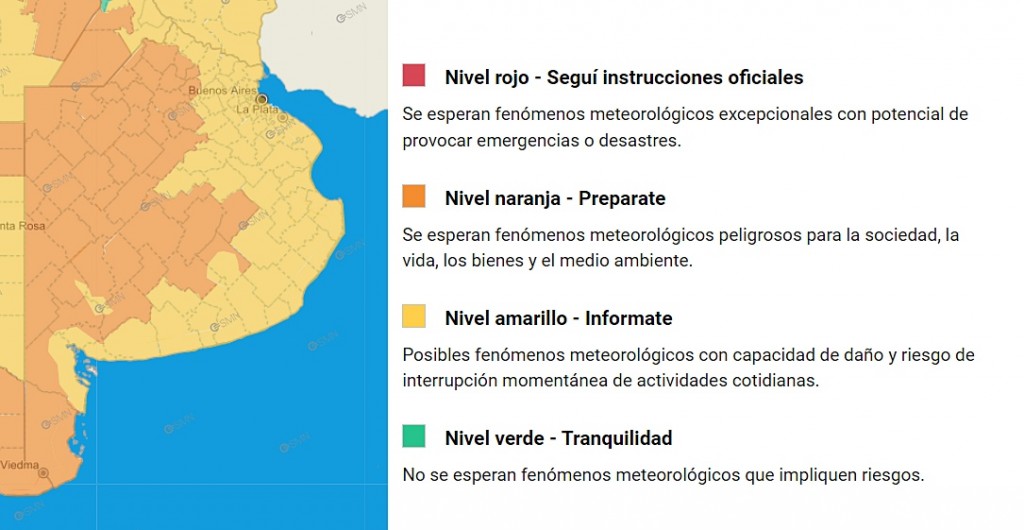 La ciudad de Buenos Aires, La Plata y localidades del este y sur bonaerense se encuentran bajo alerta amarilla, mientras que los departamentos del centro y oeste de la provincia están bajo alerta naranja.