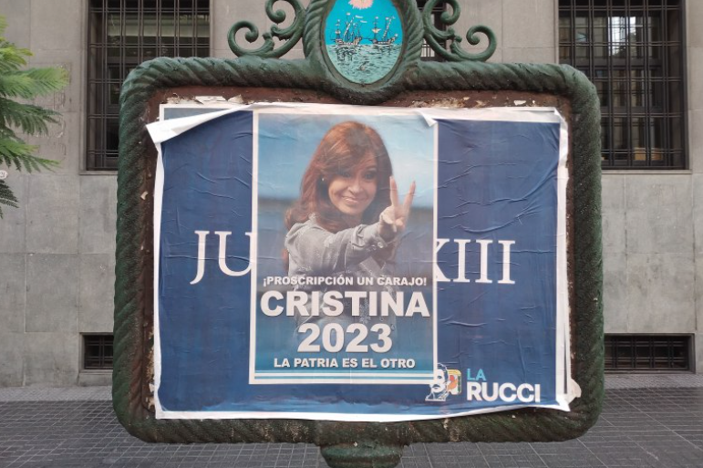 Si bien la vicepresidenta no asistió al encuentro, estuvo presente a través de afiches que empapelaron la zona con su rostro y la inscripción "Cristina 2023. Proscripción un carajo. La Patria es el otro".