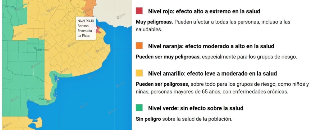 El nivel rojo de advertencia sigue para la zona del Área Metropolitana de Buenos Aires, donde ayer se alcanzó una sensación térmica de 44,1º. El resto del territorio bonaerense está con alertas naranja, al norte, y amarilla.