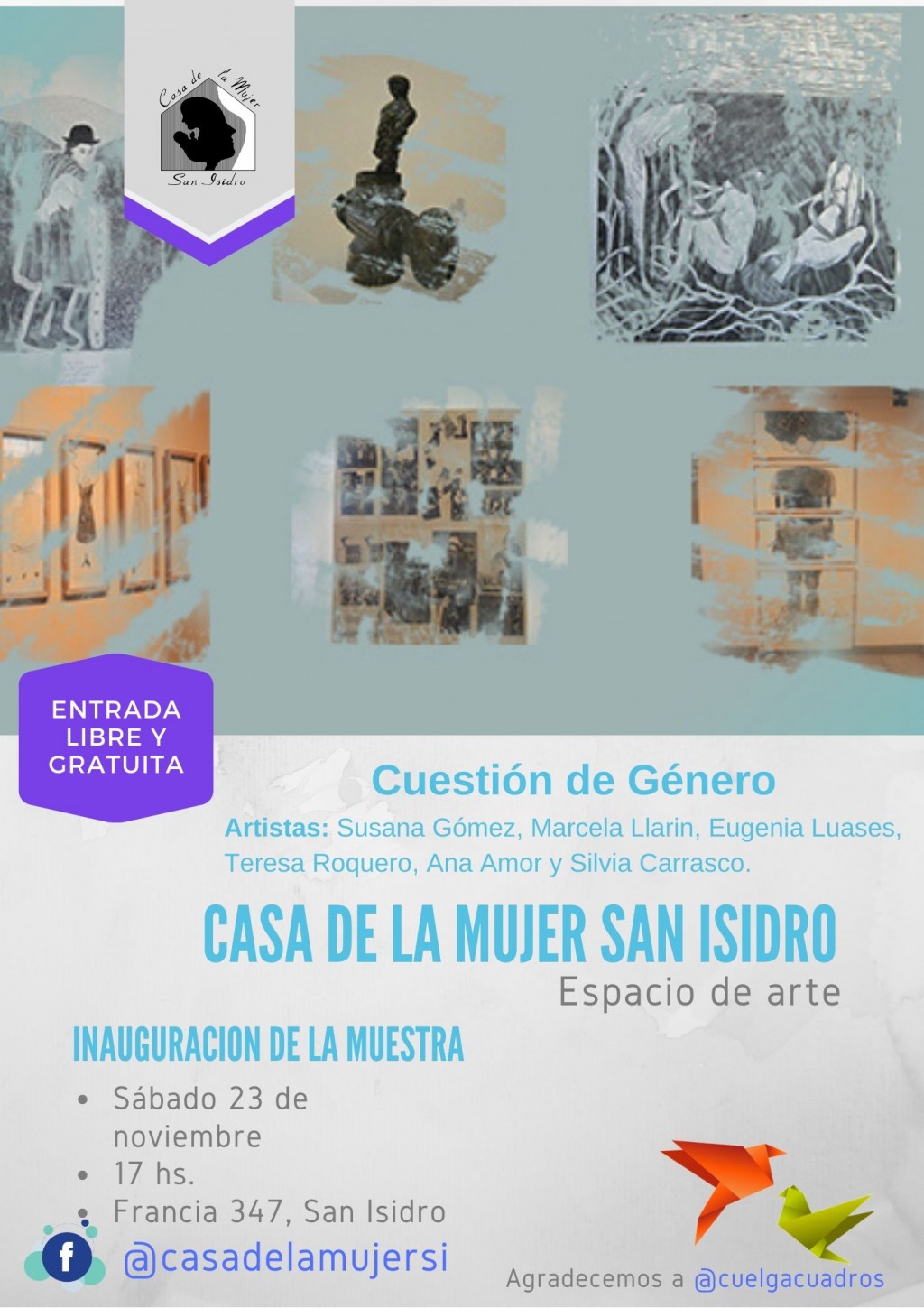 En el marco de los 16 días de activismo contra la Violencia de Género, y cerrando nuestro ciclo de exposiciones culturales del año organizadas por Casa de la Mujer San Isidro (Francia 347 de esta localidad), el sábado 23 de noviembre, a las 17 hs., se inaugurará la muestra “Cuestión de Género” de las artistas: Susana Gómez, Marcela Llarin, Eugenia Luases, Teresa Roquero, Ana Amor y Silvia Carrasco.