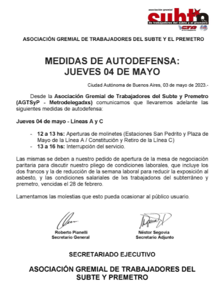Habrá un nuevo paro de subte. Esta medida gremial afectará a las líneas A y C y está prevista para este jueves 4 de mayo.