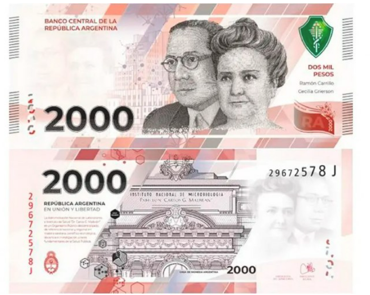El billete cuenta con la imagen del Instituto Malbrán, de la Dra. Cecilia Grierson y el Dr. Ramón Carrillo, precursores en el desarrollo de la medicina en nuestro país.