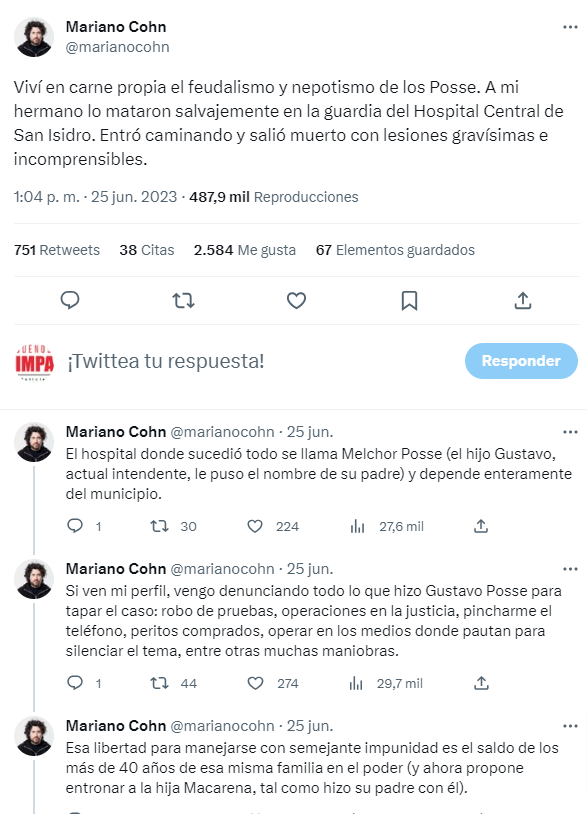 El cineasta Mariano Cohn describio en un largo twitt sus sensaciones ante la presentacion de una candidatura de Macarena Posse en San Isidro y la muerte de su hermano en San Isidro: "Viví en carne propia el feudalismo y nepotismo de los Posse. A mi hermano lo mataron salvajemente en la guardia del Hospital Central de San Isidro. Entró caminando y salió muerto con lesiones gravísimas e incomprensibles"