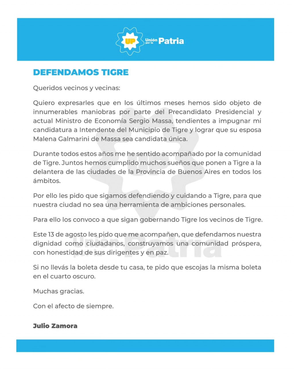 Zamora expresó que: “En los últimos meses hemos sido objeto de innumerables maniobras por parte del Precandidato Presidencial y actual Ministro de Economía Sergio Massa, tendientes a impugnar mi candidatura a Intendente del Municipio de Tigre y lograr que su esposa Malena Galmarini de Massa sea candidata única”