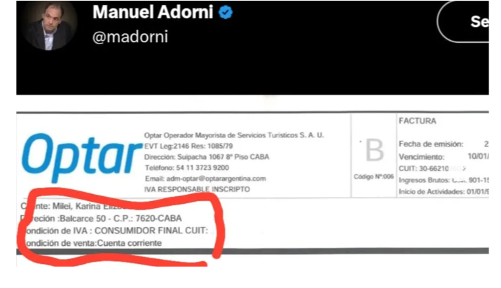 Es que intentando sobreactuar transparencia, Adorni se apuró en publicar una factura de "Optar S.A.", la empresa que habría vendido esos tickets, y en lo que posteó en la cuenta de "X", pueden observarse una serie de irregularidades asombrosas que dan la certeza de la falsificación de ese documento público.