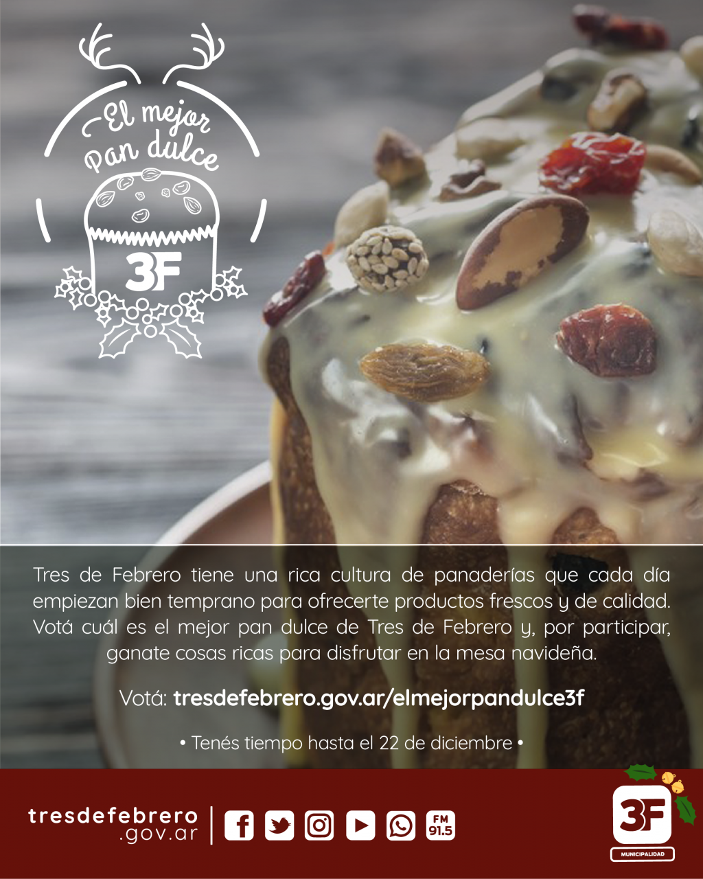 La Municipalidad de Tres de Febrero lanzó el nuevo concurso “El mejor pan dulce de 3F” para premiar a las panaderías de nuestros barrios. Podés votar a través de este formulario electrónico y participar del sorteo para quedarte con uno de estos productos.