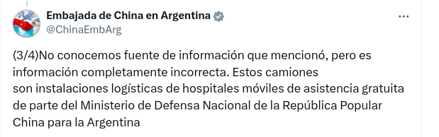 En esa línea, sostuvieron: “Estos camiones son instalaciones logísticas de hospitales móviles de asistencia gratuita de parte del Ministerio de Defensa Nacional de la República Popular China para la Argentina y no tienen nada que ver con los supuestos camiones para enfrentar al COVID que han llegado con cierto atraso”.