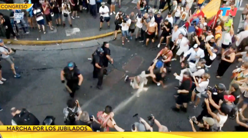 Tal como ocurrió el miércoles pasado, el llamado protocolo antipiquetes creado por el Ministerio de Seguridad se desplegó en inmediaciones del Congreso Nacional y reprimió la movilización de jubilados, que se realiza todas las semanas, y a la que se van sumando otros colectivos sociales en apoyo, como hinchas de clubes de fútbol, como el caso de los fanáticos de Chacarita, militantes de partidos de izquierda y ciudadanos de a pie.