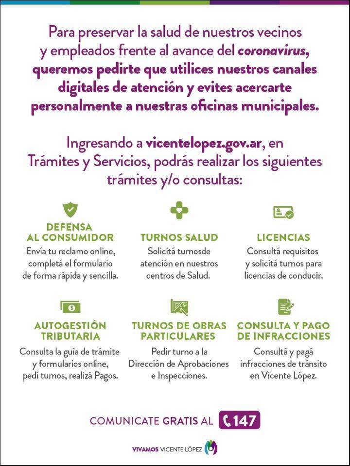 LA MUNICIPALIDAD DE VICENTE LOPEZ RECOMIENDA UTILIZAR SUS CANALES DIGITALES PARA REALIZAR TRAMITES