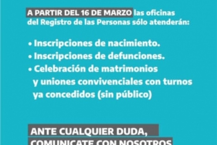 El Ministerio de Gobierno de la Provincia de Buenos Aires informa que desde el 16 de marzo en las dependencias del Registro de las Personas sólo realizarán trámites de inscripción de nacimientos o defunciones y se celebrarán, sin público, matrimonios y uniones convivenciales con turnos previamente otorgados y sólo con la presencia de los testigos requeridos por ley.