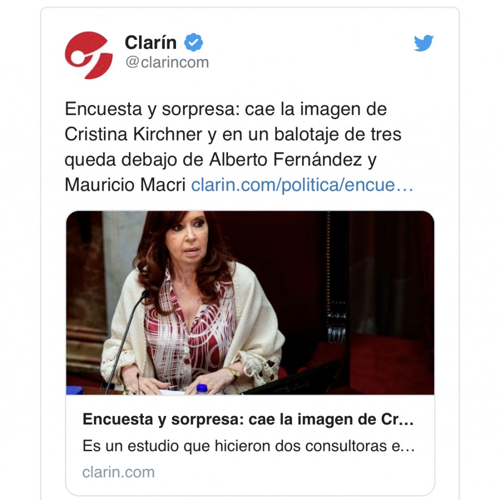 Encuesta y sorpresa: cae la imagen de Cristina Kirchner y en un balotaje de tres queda debajo de Alberto Fernández y Mauricio Macri https://t.co/OpVOpd0yIM